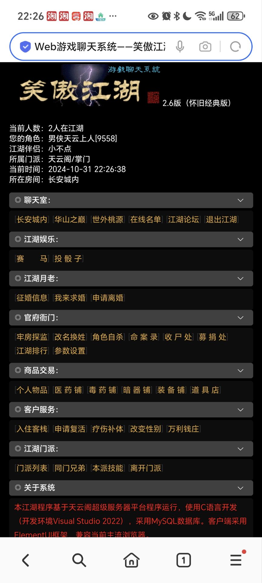 [RSA] Private = 你的RSA私鑰 Public = 10001 Module = 你的RSA模數(shù) [Setup] ;數(shù)據(jù)庫(kù)連接 MySQL = {"Host":"127.0.0.1","Port":3306,"User":"root","Passwd":"你的密碼"} ;游戲數(shù)據(jù)庫(kù) gameDB = xajh2(你自己的數(shù)據(jù)庫(kù)名) ;賬號(hào)驗(yàn)證數(shù)據(jù)庫(kù) AuthDB = tt3000db(你自己的數(shù)據(jù)庫(kù)名) MaxAnte = 1000 RoomCount = 3 [Room1] Name = 長(zhǎng)安城內(nèi) MaxUser = 2 RandomMin = 710 RandomMax = 10000 [Room2] Name = 華山之巔 MaxUser = 10 RandomMin = 710 RandomMax = 10000 [Room3] Name = 世外桃源 MaxUser = 1 RandomMin = 710 RandomMax = 10000